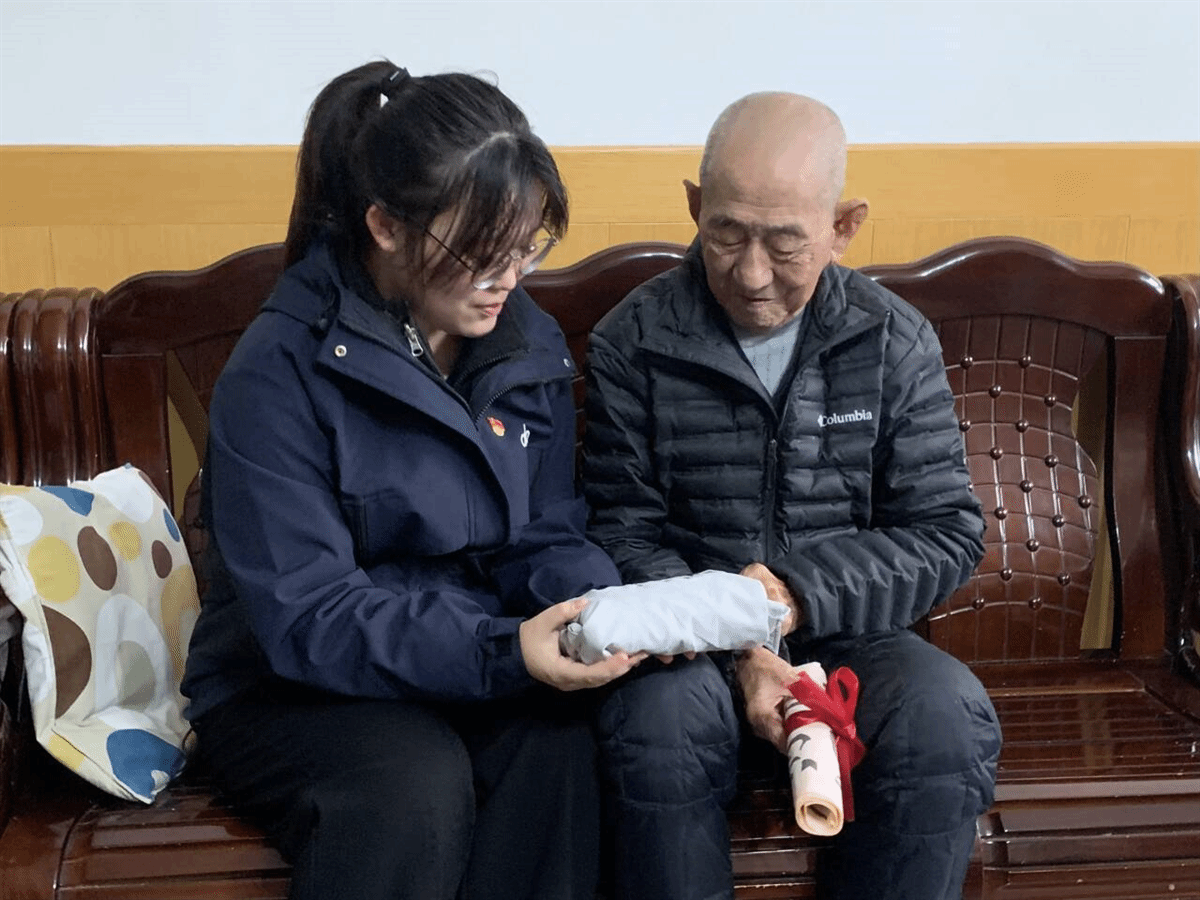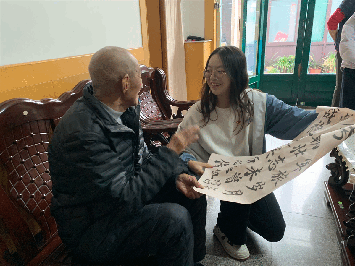 活动尾声,党员刘佳楠与“益”心“益”意青年志愿者协会代表牛赫,将两幅精心书写的毛笔字赠予老兵。“犹记军旅岁月长,今朝壮志未曾忘”的诗句,以笔墨传递着对革命先辈的崇敬与祝福。老兵与学子们共同展示书法作品,在温馨的互动中,红色精神的火种在青年一代心中悄然延续。